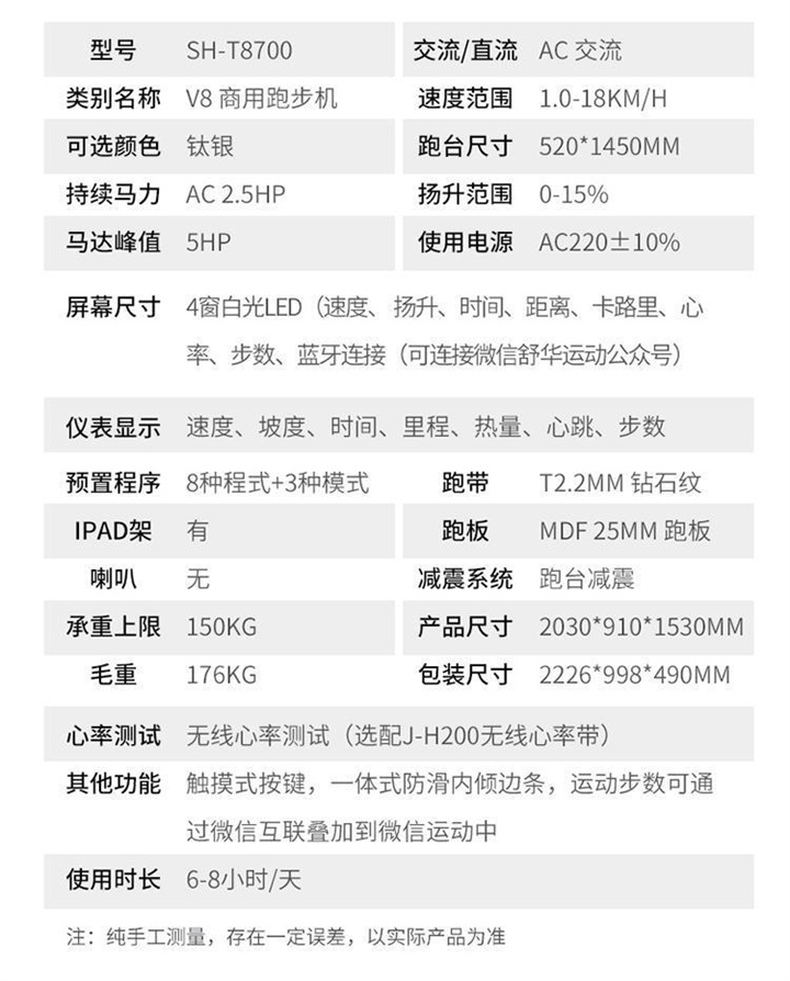 舒華商用跑步機SH-T8919采用t2.2mm黑鉆紋(可選配:t2.4免維護跑帶)的跑帶,,選用手握心率測試 自帶心率帶及增加心率控速(HRC)程序模塊、接觸式心率感應測量心跳等數據,跑步面積達580×1570mm,可承受180kg的使用者使用。