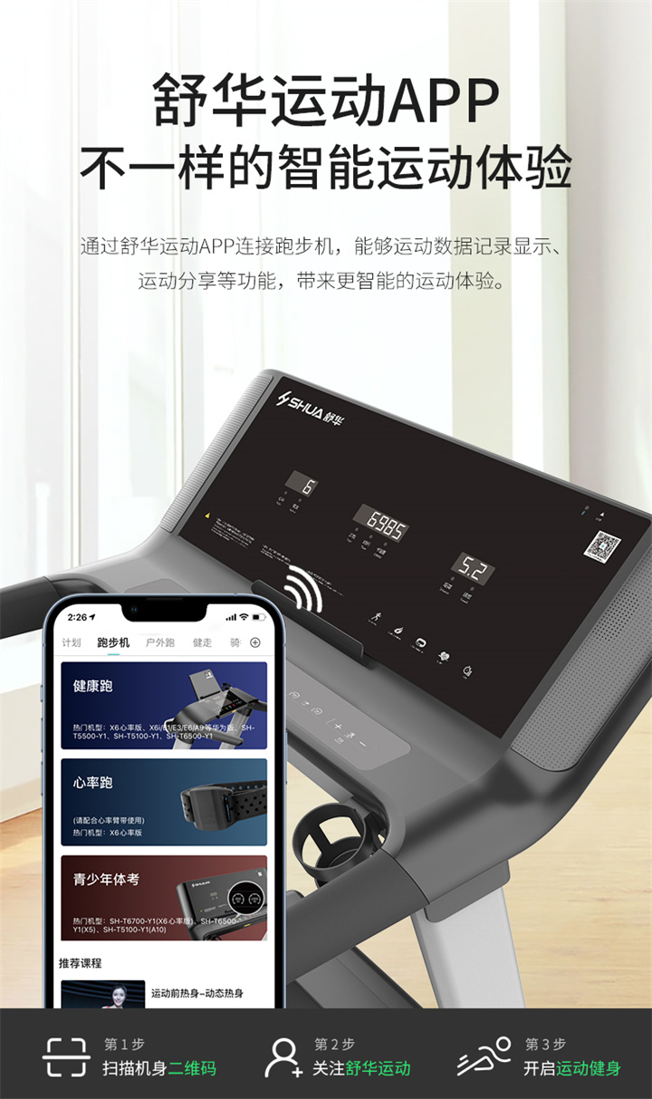 舒華家用跑步機SH-T6700(X6)采用18T+12T雙層跑板,T2.2mm鉆石紋的跑帶,雙層跑板全跑臺減震,對您跑步中的膝蓋進(jìn)行全方位的呵護,選用接觸式心率感應和無(wú)線(xiàn)心率感應等多種方式獲取數據,跑步面積達520×1450mm,可承受130kg的使用者使用。