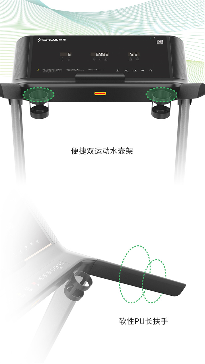 舒華跑步機SH-T5500采用T18mm的跑板,T1.6 鉆石紋的跑帶,運用6位硅膠減震,對您跑步中的膝蓋進(jìn)行全方位的呵護,選用手握心率測試,跑步面積達480×1350mm,可承受126kg的使用者使用。
